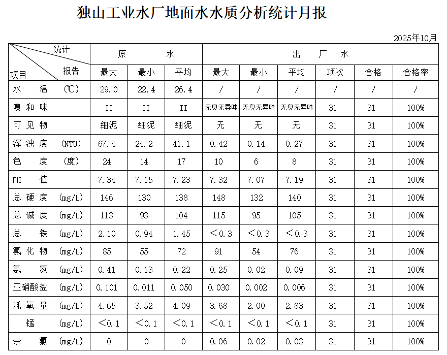 独山工业水厂地面水水质分析统计10月月报